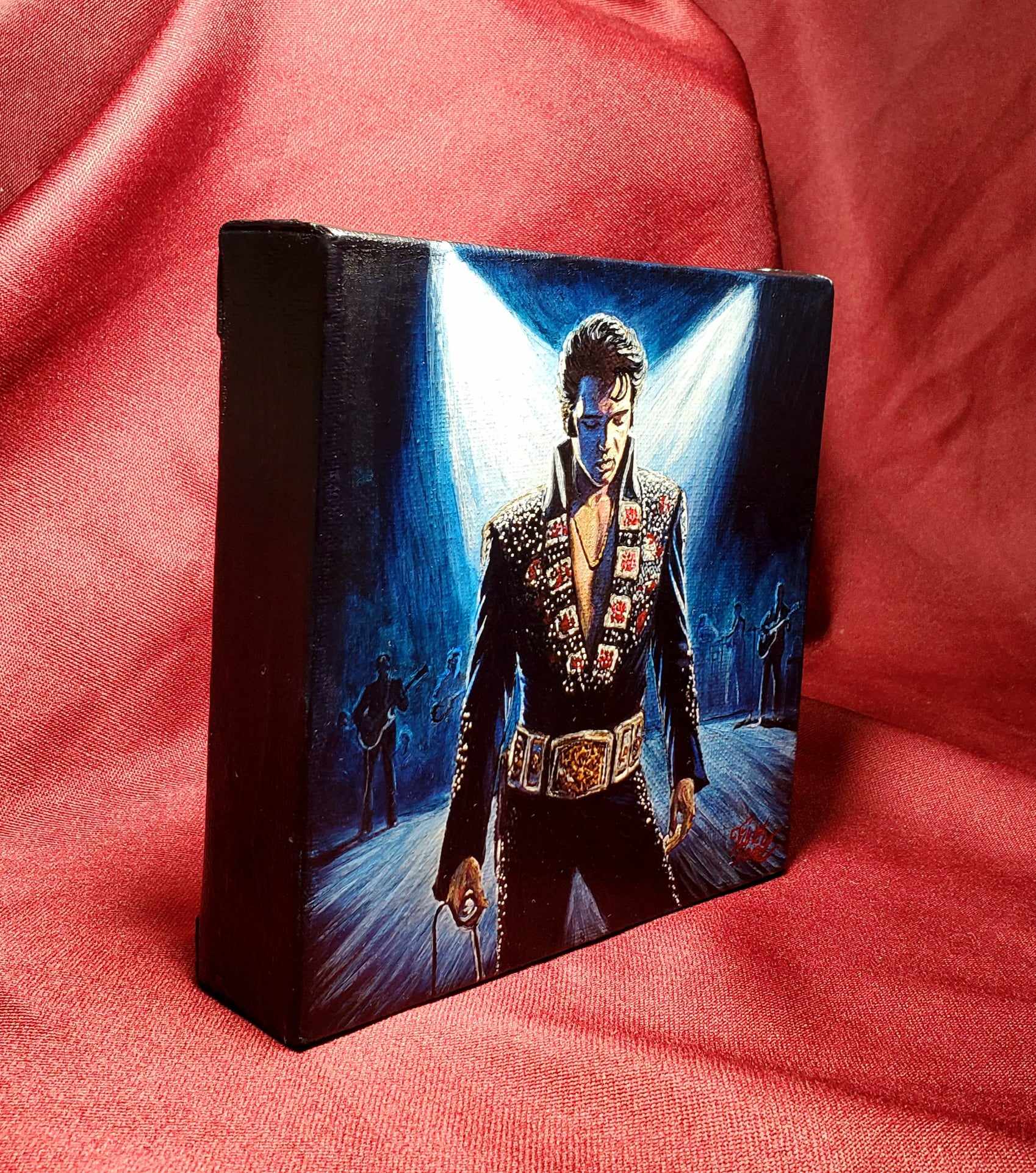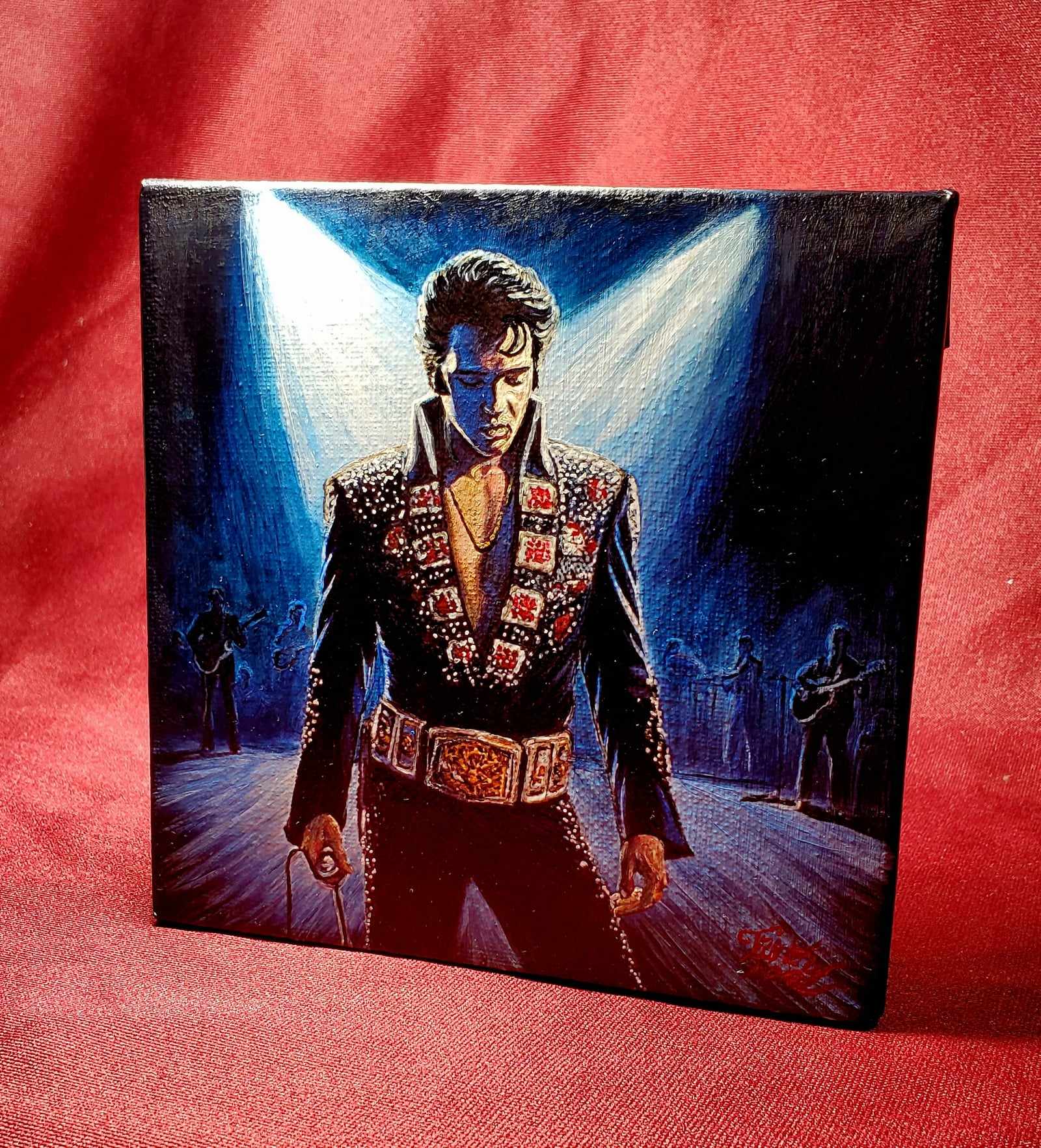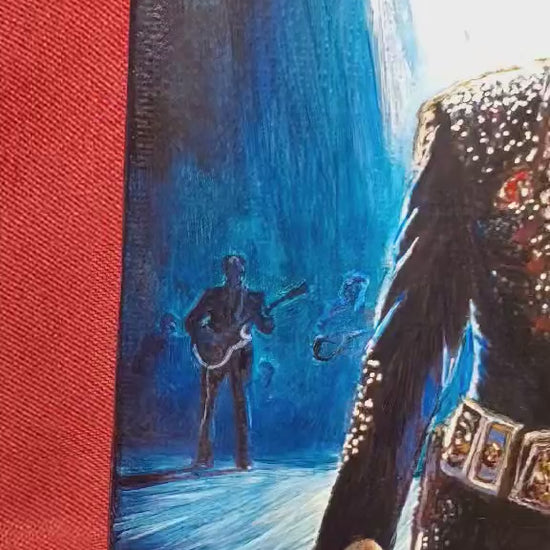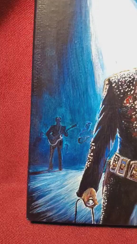This stunning painting, titled "Tomorrow Never Comes," captures the essence of Elvis Presley on stage. This is a brand new painting. As with much of my work, the painting has a strong appeal even in low light. You can see the sparkle of the costume, feel the silence as he pauses between songs. This hand painted portrait is one of a kind, never to be duplicated. The top quality, 6x6 canvas is stretched on a thick solid wood frame, the 2 inch depth also makes it a solid and heavy piece. This is an original painting, not a print or reproduction.